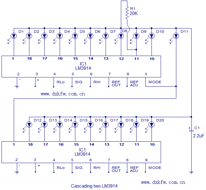 兩個或兩個以上的LM3914芯片可以級聯在一起,得到一個擴展顯示。兩個LM3914集成電路cacaded合力得到了20顆LED的電壓水平指示器的示意圖如下所示。