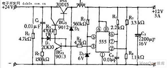 此電路由555擔任脈沖振蕩器。555的⑤腳接有穩壓管以獲得+6V基準電壓,②腳從R7、R8組成的取樣電路中獲得取樣電壓。當②腳電壓小于+3V時,③腳則輸出高電平,使BG3、BG1、BG2飽和導通,向負載供電。與此同時,電源經R6向C2充電,當⑥⑦腳電位達到+9V時。若②腳也達到+3V以上,則③腳輸出低電平,電容經⑦腳放電,開關管BG3、BG1、BG2均截止。當②腳所接電容的電壓低于+3V時,③腳又輸出高電平,如此不斷反復而使輸出電壓值穩定于額定輸出電壓12V上。
