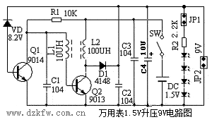 C1、L1、L2、R1、Q2組成振蕩器,電路振蕩后,在Q2的集電極感應(yīng)出很高的交流電壓,經(jīng)D1整流,C2濾波后,一路經(jīng)一個(gè)100Ω限流電阻送到輸出轉(zhuǎn)換插座;另一路反饋回去控制振蕩器,當(dāng)電壓升高到穩(wěn)壓二極管VD的擊穿電壓后8.9V(8.2V+0.7V)后,二極管VD擊穿導(dǎo)通,Q1導(dǎo)通,Q2的基極電壓被拉低,使得振蕩電路停止振蕩。輸出電壓降低,當(dāng)降低到穩(wěn)壓二極管VD的擊穿電壓后,二極管VD截止,Q1截止,Q2的基極電壓又恢復(fù)到放大狀態(tài),振蕩電路又起振工作,輸出電壓又開始上升。就這樣一直重復(fù)著,使輸出電壓穩(wěn)定在8.9V左右。