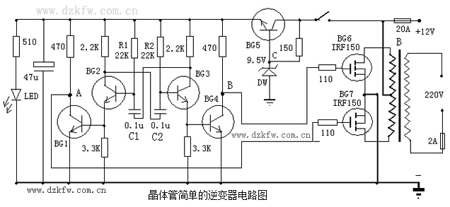 這是一款非常容易制作的逆變器,可以將12V電源電壓變為220V市電,電路由BG2和BG3組成的多諧振蕩器推動,再通過BG1和BG2驅動,來控制BG6和BG7工作。