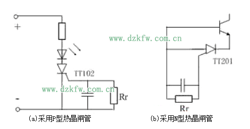 本文介紹了一款直流開關電源內部器件過熱保護電路。該電路采用溫度繼電器來檢測電源裝置內部的溫度,當電源裝置內部產生過熱時,溫度繼電器就動作,使整機告警電路處于告警狀態,實現對電源的過熱保護。如下圖(a)所示,在保護電路中將P型控制柵熱晶閘管放置在功率開關三極管附近,根據TT102的特性(由 Rr 值確定該器件的導通溫度, Rr 越大,導通溫度越低),當功率管的管殼溫度或者裝置內部的溫度超過允許值時,熱晶閘管就導通,使發光二極管發亮告警。倘若配合光電耦合器,就可使整機告警電路動作,保護開關電源。該電路還可以設計成如圖(b)所示,用作功率晶體管的過熱保護,晶體開關管的基極電流被N型控制柵熱晶閘管TT201旁路,開關管截止,切斷集電極電流,防止過熱。