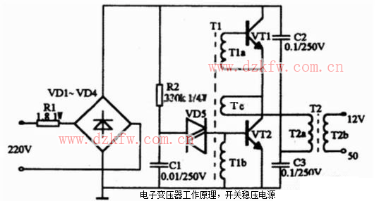 工作原理電路如上圖所示。電子變壓器原理與開關電源工作原理相似,二極管VD1~VD4構成整流橋把市電變成直流電,由振蕩變壓器T1,三極管VT1、VT2組成的高頻振蕩電路,將脈動直流變成高頻電流,然后由鐵氧體輸出變壓器T2對高頻高壓脈沖降壓,獲得所需的電壓和功率。R1為限流電阻。電阻R2、電容C1和雙向觸發二極管VD5構成啟動觸發電路。 三極管VT1、VT2選用S13005,其B為15~2 0倍。也可用C3093等BUceo>=35OV的大功率三極管。觸發二極管VD5選用32V左右的DB3或VR60。振蕩變壓器可自制,用音頻線繞制在 H7 X 10 X 6的磁環上。TIa、T1b繞3匝,Tc繞1匝。鐵氧體輸出變壓器T2也需自制,磁心選用邊長27mm、寬20mm、厚10mm的EI型鐵氧體。T2a用直徑為0.45mm高強度漆包線繞100匝,T2b用直徑為1.25mm高強度漆包線繞8匝。 二極管VD1~VD4選用 IN4007型,雙向觸發二極管選用DB3型,電容C1~C3選用聚丙聚酯滌綸電容,耐壓250V。