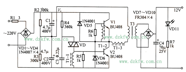 本電子變壓器工作原理與開關電源相似,電路原理圖見圖1,由VD1-VD4將市電整流為直流,再把直流變成幾十千赫茲的 高頻電流,然后用鐵氧休變壓器對高頻、高壓脈沖降壓。圖中R2、C1、VD5為啟動觸發電路。C2、C3、L1、L2、L3、VT1、VT2構成高頻振蕩部分。