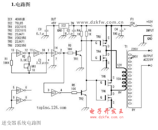 這里介紹的逆變器(見圖1)主要由MOS場(chǎng)效應(yīng)管,普通電源變壓器構(gòu)成。其輸出功率取決于MOS場(chǎng)效應(yīng)管和電源變壓器的功率,免除了煩瑣的變壓器繞制,適合電子愛好者業(yè)余制作中采用。下面介紹該逆變器的工作原理及制作過程。