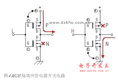 下面簡(jiǎn)述一下用C-MOS場(chǎng)效應(yīng)管(增強(qiáng)型MOS場(chǎng)效應(yīng)管)組成的應(yīng)用電路的工作過程(見圖4)。電路將一個(gè)增強(qiáng)型P溝道MOS場(chǎng)效應(yīng)管和一個(gè)增強(qiáng)型N溝道MOS場(chǎng)效應(yīng)管組合在一起使用。當(dāng)輸入端為低電平時(shí),P溝道MOS場(chǎng)效應(yīng)管導(dǎo)通,輸出端與電源正極接通。當(dāng)輸入端為高電平時(shí),N溝道MOS場(chǎng)效應(yīng)管導(dǎo)通,輸出端與電源地接通。在該電路中,P溝道MOS場(chǎng)效應(yīng)管和N溝道MOS場(chǎng)效應(yīng)管總是在相反的狀態(tài)下工作,其相位輸入端和輸出端相反。通過這種工作方式我們可以獲得較大的電流輸出。同時(shí)由于漏電流的影響,使得柵壓在還沒有到0V,通常在柵極電壓小于1到2V時(shí),MOS場(chǎng)效應(yīng)管既被關(guān)斷。不同場(chǎng)效應(yīng)管其關(guān)斷電壓略有不同。也正因?yàn)槿绱耍沟迷撾娐凡粫?huì)因?yàn)閮晒芡瑫r(shí)導(dǎo)通而造成電源短路。