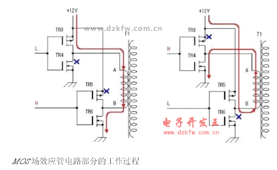 由以上分析我們可以畫出原理圖中MOS場(chǎng)效應(yīng)管電路部分的工作過程(見圖5)。工作原理同前所述。這種低電壓、大電流、頻率為50Hz的交變信號(hào)通過變壓器的低壓繞組時(shí),會(huì)在變壓器的高壓側(cè)感應(yīng)出高壓交流電壓,完成直流到交流的轉(zhuǎn)換。這里需要注意的是,在某些情況下,如振蕩部分停止工作時(shí),變壓器的低壓側(cè)有時(shí)會(huì)有很大的電流通過,所以該電路的保險(xiǎn)絲不能省略或短接。
