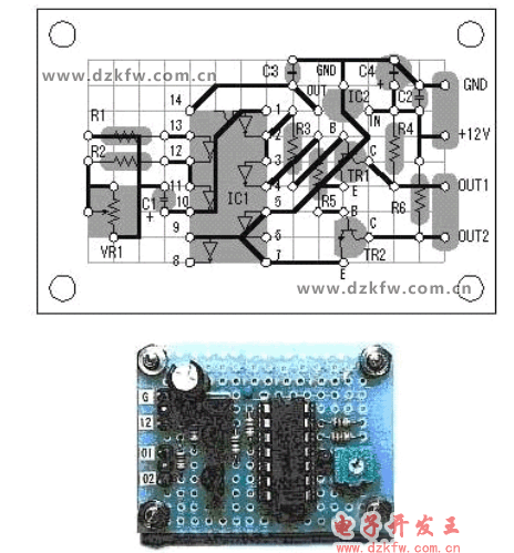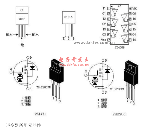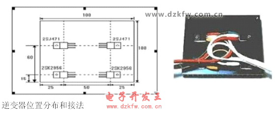 電路板見圖6。所用元器件可參考圖7。逆變器用的變壓器采用次級(jí)為12V、電流為10A、初級(jí)電壓為220V的成品電源變壓器。P溝道MOS場(chǎng)效應(yīng)管(2SJ471)最大漏極電流為30A,在場(chǎng)效應(yīng)管導(dǎo)通時(shí),漏-源極間電阻為25毫歐。此時(shí)如果通過10A電流時(shí)會(huì)有2.5W的功率消耗。N溝道MOS場(chǎng)效應(yīng)管(2SK2956)最大漏極電流為50A,場(chǎng)效應(yīng)管導(dǎo)通時(shí),漏-源極間電阻為7毫歐,此時(shí)如果通過10A電流時(shí)消耗的功率為0.7W.由此我們也可知在同樣的工作電流情況下,2SJ471的發(fā)熱量約為2SK2956的4倍。所以在考慮散熱器時(shí)應(yīng)注意這點(diǎn)。圖8展示本文介紹的逆變器場(chǎng)效應(yīng)管在散熱器(100mm×100mm×17mm)上的位置分布和接法。盡管場(chǎng)效應(yīng)管工作于開關(guān)狀態(tài)時(shí)發(fā)熱量不會(huì)很大,出于安全考慮這里選用的散熱器稍偏大。