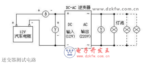 測(cè)試電路見圖9.這里測(cè)試用的輸入電源采用內(nèi)阻低、放電電流大(一般大于100A)的12V汽車電瓶,可為電路提供充足的輸入功率。測(cè)試用負(fù)載為普通的電燈泡。測(cè)試的方法是通過改變負(fù)載大小,并測(cè)量此時(shí)的輸入電流、電壓以及輸出電壓。輸出電壓隨負(fù)荷的增大而下降,燈泡的消耗功率隨電壓變化而改變。我們也可以通過計(jì)算找出輸出電壓和功率的關(guān)系。但實(shí)際上由于電燈泡的電阻會(huì)隨受加在兩端電壓變化而改變,并且輸出電壓、電流也不是正弦波,所以這種的計(jì)算只能看作是估算。