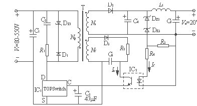 第七步確定反饋繞組的參數,反饋是反激的電壓,其電壓是取自輸出級的,所以反饋電壓是穩定的,TOP 的電源電壓是5.7到9V,繞上7匝,那么其電壓大概是6V多,這就可以了,記得,反饋電壓是反激的,其匝數比要和幅邊對應,懂什么意思嗎,至于線,因為流過其的電流很小,所以就用繞原邊的線繞就可以了,無嚴格的要求.