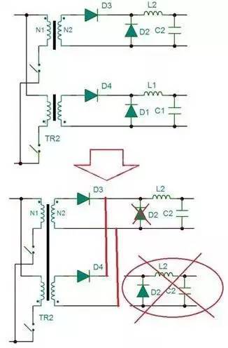 由于不需要儲能電感的續流功能,所以續流二極管D2也只可以省略。即原邊輸入級采用兩路正激變換器的輸入級交錯并聯,副邊合理的節省部分整流、濾波電路后,即派生出典型的推挽式開關電源變換器。