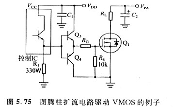 圖騰柱屬于推挽電路,因而能夠主動對VMOS的柵極停止放電,這樣一來,柵極泄放電阻能夠省略,也能夠取比擬大的數值,以防萬一。假如IC內部的驅動才能缺乏,外部能夠增加擴流電路,常見的電路方式也是圖騰柱的電路。關于集電極開路輸出的IC,如TTL集成電路,外接擴流電路時,通常并不從集電極取信號,而是從發射極取信號(圖5. 75),這樣—來,內部的集電極開路輸出級就變成了射極跟隨器,既降低了輸出阻抗,也有利于開關速度的進步。
