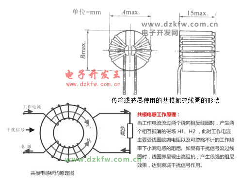 圖中,電感的兩個線圈繞在同一磁芯上(同名端都在線圈左側),這種接線對差模電流(包括電源電流)產生的磁通相互抵消,不會產生磁路飽和;而對共模電流則體現一個很大的電感,取得大的濾波效果,故這個電感被稱為共模電感。濾波器的這一結構特點說明它在很大程度上是用來對付共模干擾的。對一定尺寸的濾波器來說,在磁芯選定以后,電感線圈的電感量將取決于所用導線的線徑,電流小的線徑較細,線圈匝數可多一點,電感量就大一點;反之亦反。其典型值為幾mH到零點幾mH。