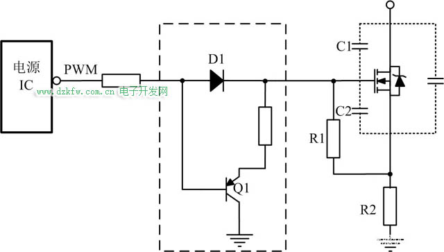 這種驅(qū)動電路好處是提升電流提供能力,迅速完成對于柵極輸入電容電荷的充電過程。這種拓?fù)湓黾恿藢?dǎo)通所需要的時間,但是減少了關(guān)斷時間,開關(guān)管能快速開通且避免上升沿的高頻振蕩。