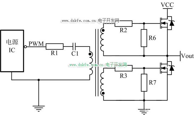 為了滿足高端MOS管的驅(qū)動,經(jīng)常會采用變壓器驅(qū)動。其中R1目的是抑制PCB板上寄生的電感與C1形成LC振蕩,C1的目的是隔開直流,通過交流,同時也能防止磁芯飽和。