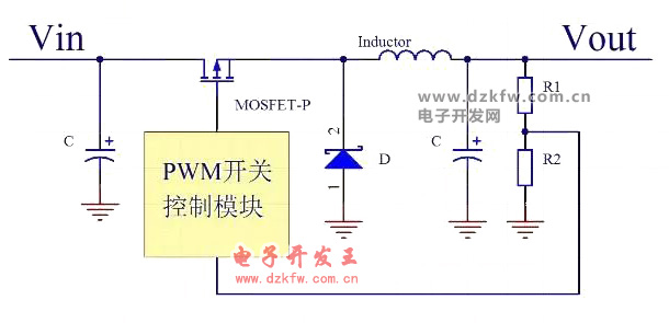 Buck 模式DCDC 結構主要由輸入電容、功率MOS管、PWM模塊、肖特基二極管、功率電感、輸出電容和輸出調節電阻構成。DCDC開關電源這種結構模式決定了它輸出噪聲比較大。