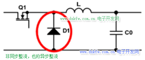 以BUCK電路為例,若電路中只有一個MOS管(功率管),而在續(xù)流回路中采用的是整流二極管(二極管具有單向?qū)щ娦裕恍枰饧与娐房刂破渫〝啵瑒t該電路就是非同步的,因為它只有一個 mos管(或者說開關(guān)管)需要用電路控制,續(xù)流二極管不需要控制電路,也就不用去強調(diào)同步控制二極管(D1),即可以理解為非同步,非同步電路如圖1