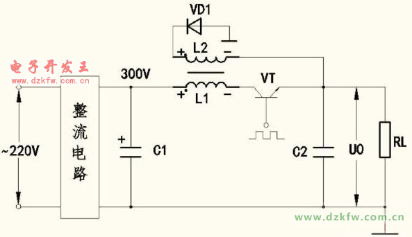 開關管VT的基極加有脈沖信號,當脈沖信號高電平送到VT的基極時,VT飽和導通,300V的電壓經L1、VT的集電極和發射極對電容C2充電,在C2上充得上正、下負的電壓,充電電流在經過L1時,L1會產生左正、右負的電動勢阻礙電流,L2上會感應出左正、右負的電動勢(同名端極性相同),續流二極管VD1截止;當脈沖信號低電平送到VT的基極時VT截止,無電流流過L1,L1馬上產生左負、右正的電動勢,L2上感應出左負、右正的電動勢,二極管VD1導通,L2上的電動勢對C2充電。