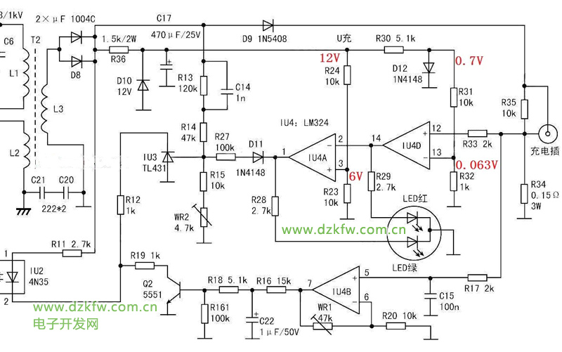 R34是電流取樣電阻,當充電電流大于0.42A(0.063V/0.15R = 0.42A)時,IU4D的同相端大于反相端,運放輸出電源電壓,LED紅亮起