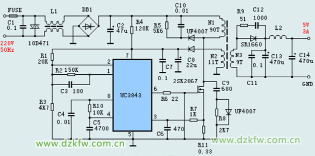 開關電源電路圖----以UC3843為核心的單端反激式開關穩壓電源