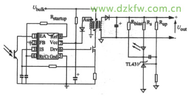 在上圖中直接從1腳反饋的好處是能使電源的動態響應更快,而且還簡化了1腳和2腳之間RC網絡的設計。因為誤差放大器用作信號傳輸時都需要傳輸時間,并不是輸出與輸入同時建立。由于TL431內部有一個高增益的誤差放大器,如果把反饋信號接到2腳的電壓反饋端,則反饋信號要通過兩個高增益誤差放大器,傳輸時間增長。而且直接采用1腳做反饋,還能起到過載保護的功能,當電源過載或輸出短路時,流過光耦中的二極管的電流會迅速增大,1腳的電壓很快就被拉低。1腳的電壓低于1V時,UC3843就會關閉6腳輸出,從而保護了電源。