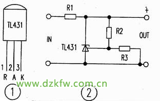 精密電壓基準IC TL431是T0—92封裝如圖1所示。其性能是輸出壓連續可調達36V,工作電流范圍寬達0.1。100mA,動態電阻典型值為0.22歐,輸出雜波低。圖2是TL431的典型應用,其中③、②腳兩端輸出電壓V=2.5(R2十R3)V/R3。如果改變R2的阻值大小,就可以改變輸出基準電壓大小。圖3是利用它作電壓基準和驅動外加場效應管K790作調整管構成的輸出電流大(約6A)、電路簡單、安全的穩壓電源。