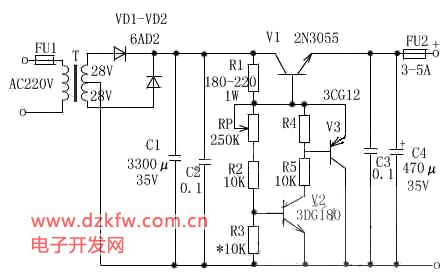 如圖3所示,220v電壓經變壓器B降壓、D1-D4整流、C1濾波。此外D5、D6、C2、C3組成倍壓電路(使得Vdc=60V),Rw、R3組成分壓電路,T1431、R1組成取樣放大電路,9013、R2組成限流保護電路,場效應管K790作調整管(可直接并聯使用)以及C5是輸出濾波器電路等。穩壓過程是:當輸出電壓降低時,f點電位降低,經T1431內部放大使e點電壓增高,經K790調整后,b點電位升高;反之,當輸出電壓增高時,f點電位升高,e點電位降低,經K790調整后,b點電位降低。從而使輸出電壓穩定。當輸出電流大于6A時,三極管9013處于截止,使輸出電流被限制在6A以內,從而達到限流的目的。本電路除電阻R1選用2W、R2選用5W外,其它元件無特殊要求,其元件參數如圖3所示。