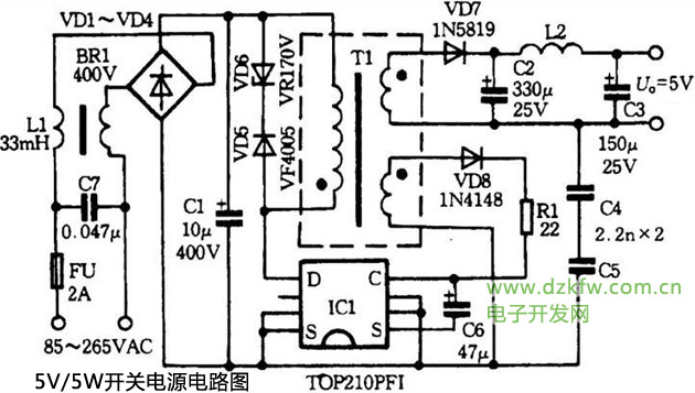 最簡(jiǎn)單的5V/5W開(kāi)關(guān)電源實(shí)際如圖所示。圖中TOP210(IC1)為三端PWM開(kāi)關(guān)。IC1中含有5V/5W開(kāi)關(guān)電源的成本比常用的線性電源成本低。