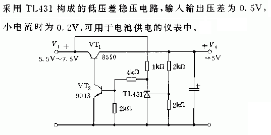 采用TL431構成的低壓差穩壓電路,輸入輸出壓差為0.5v,小電流時為0.2v,可用于電池供電的儀表中。