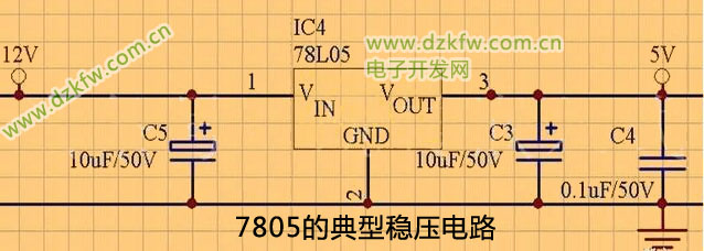 78M05左端1腳為輸入端(input),中間2腳為公共端(common),右端3腳為輸出端(output);