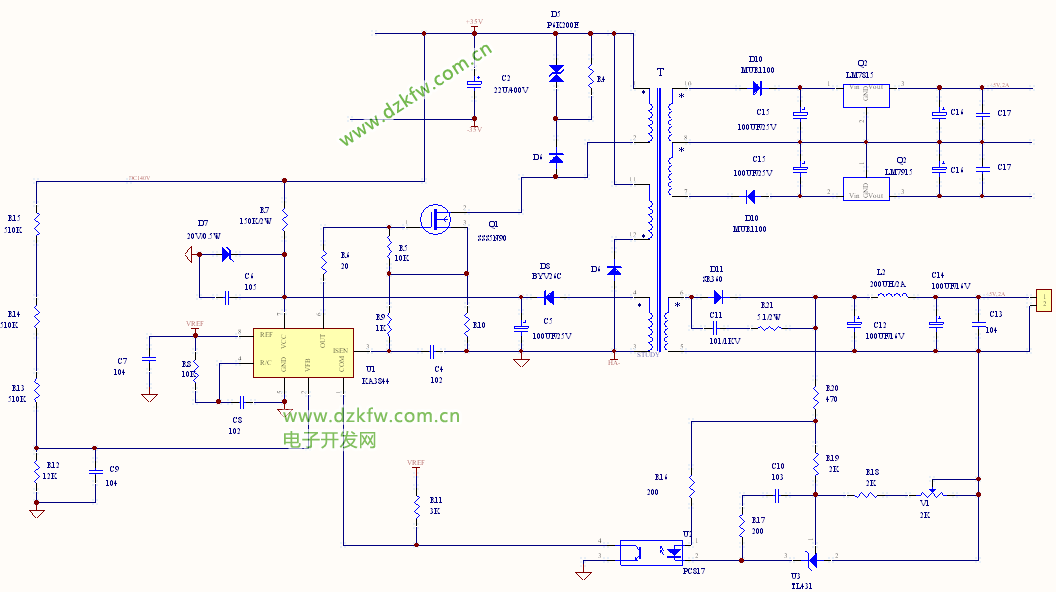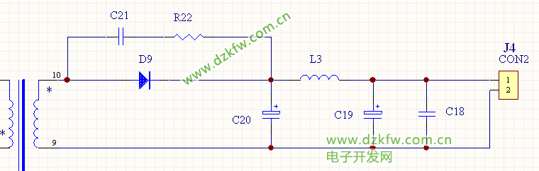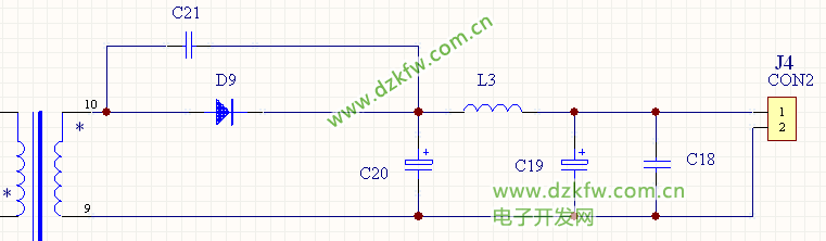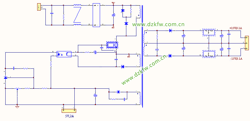 3)變壓器T1除了有初次級安全隔離作用外,它還有變壓器額流圈的作用,所以反激式工作方式次級部需要加電感,但實際設計中在濾波電容之外加一小電感,用以降低開關噪聲。
