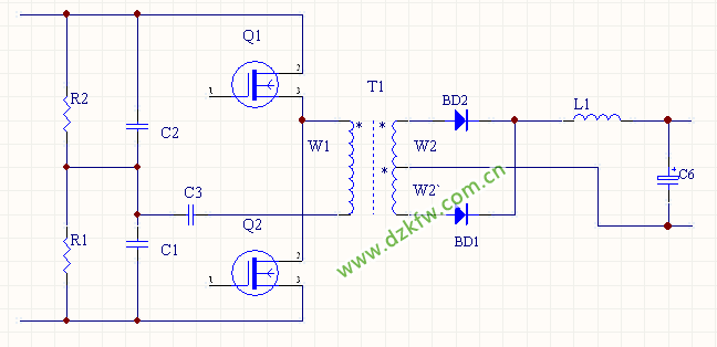 2)t1—t2:所有開關斷開,W1電流為零,電感經過D1、D2續流,各占電感點流的一半,電感L的電流逐漸下降;