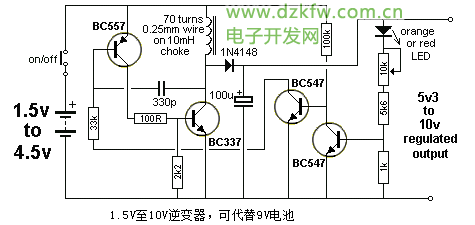 這是個非常巧妙的電路,能將1.5V電壓轉換至10V,以取代那些昂貴的9V電池,并還為微控制器項目提供了一個5V電源。