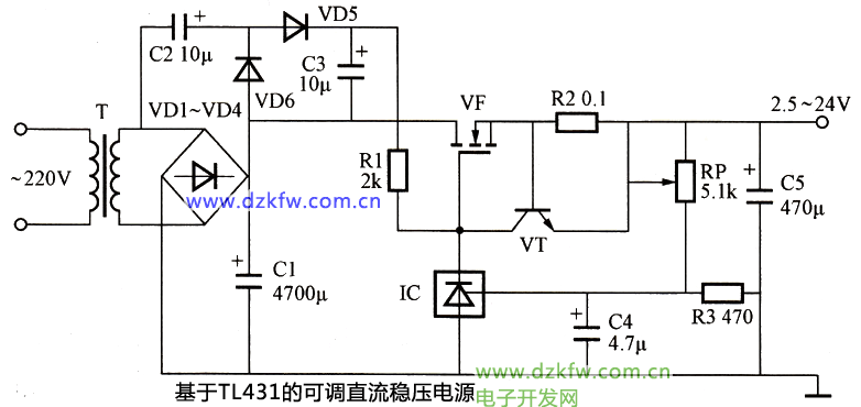 TL431是具有TO-92和DIP-8兩種封裝的精密型可調穩(wěn)壓集成電路,芯片具有體積小、基準 電壓精密可調,輸出電流大、性能優(yōu)良等特點,可廣泛用于單片精密開關電源或精密線性穩(wěn) 壓電源中。利用TL431構成的可調直流穩(wěn)壓電源典型電路如圖1所示,該電路具有輸出電流大 (最大輸出電流為6A)、電路簡單、使用安全可靠等特點,其輸出電壓可在2.5~24V之間連 續(xù)可調。適用于中、小功率用電設備、設施用電。