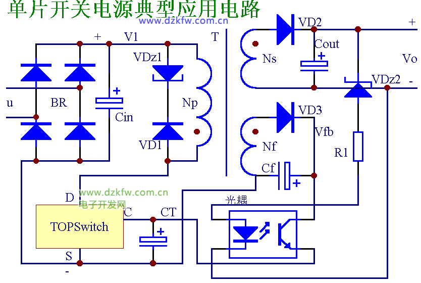 該電源采用配穩壓管的光耦反饋電路。反饋繞組電壓經過VD3、Cf整流濾波后獲得反饋電壓Vfb,經光耦合器中的光敏三極管給TOPSwitch的控制端提供偏壓。CT是控制端C的旁路電容。設穩壓管VDz2的穩定電壓為Vz2,限流電阻R1兩端電阻的壓降為Vr,光耦合器中LED發光二極管的正向壓降為VF,輸出電壓VO由下式設定:  VO=Vz2+VF+Vr