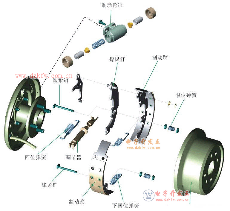 鼓式制動器可以應用在前輪,也可以應用在后輪。鼓式制動器相對盤式制動器有更多的組成部件,其基本部件主要包括底板、制動輪缸、回位彈簧、限位彈簧、調節器、制動蹄、制動鼓等。