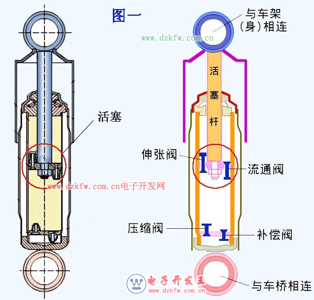 當減震受力壓縮時,活塞受到汽車重量下行,使下室的油壓高于上室。減震底部是高壓氮氣,導致減震油沒法在往下擠壓,所以下室的減震油只能上行頂開流通閥流到上室。上行的油壓流速取決與下行的壓力,下行壓力被上行的減震油通過流通閥流動量產生了阻力,減小了下行速度就產生了減震力。