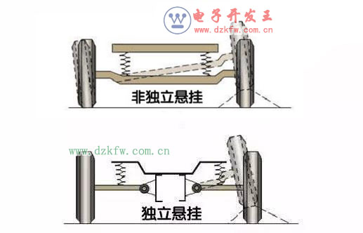 獨立懸掛,就是左右兩個車輪沒連在一根剛性車軸上,而是各自通過連桿、彈簧與車身相連,是各走各的路,各跳各的獨舞,任何一個輪子受到路面沖擊而跳動時不致影響另一個輪子的運作。這類懸掛彈性較佳,可吸收路面震動,高速時行駛穩(wěn)定,而且由于無連接軸,可以降低發(fā)動機和駕駛室的高度,增大車廂和行李箱空間。轎車大多都采用獨立懸掛。