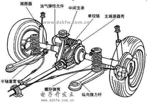 (1)由于左、右車輪的運(yùn)動(dòng)相對獨(dú)立、互不影響,以減少行駛時(shí)車架或車身的振動(dòng),同時(shí)可以減弱轉(zhuǎn)向輪的偏擺。