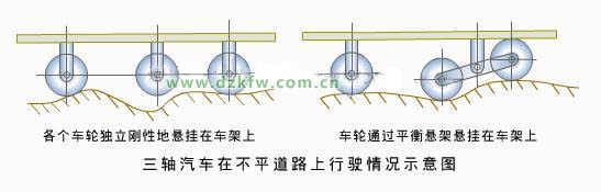 如果多軸車輛的全部車輪都是單獨地剛性懸掛在車架上,在不平道路上行駛時將不能保證所有車輪同時接觸地面。當使用彈性懸架而道路不平度較小時,雖然不一定會出現車輪懸空現象,但各個車輪間垂直載荷的分配比例會有很大改變。當車輪垂直載荷變小甚至為零時,車輪對地面的附著力隨之變小甚至為零。轉向車輪遇此情況將使汽車操縱能力大大降低以致失去操縱;驅動車輪遇此情況將不能產生足夠的驅動力。此外,還會使其他車橋及車輪有超載的危險。全部車輪采用獨立懸架,可以保證所有車輪與地面的良好接觸,但將使汽車結構變得復雜,對于全輪驅動的多軸汽車尤其是如此。