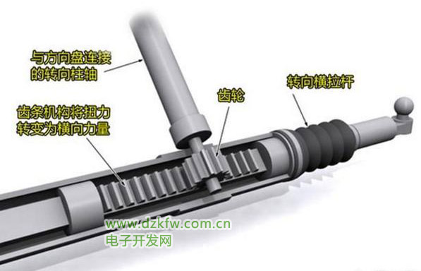 當轉動方向盤時,轉向齒輪帶動轉向齒條左右移動,轉向橫拉桿再改變車輪方向,即可控制汽車向左、向右轉。