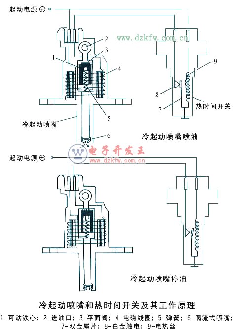 冷起動噴嘴的功用 是當發動機 低溫起動時,向進氣管噴入一定數量附加的汽油,以加濃混合氣。冷起動噴嘴也是一個電磁閥,故又稱冷起動閥。冷起動噴嘴的開啟和持續噴油的時間取決于發動機 的溫度,并由熱時間開關控制。冷起動噴嘴安裝在進氣管上,熱時間開關裝在機體上并與冷卻液接觸。