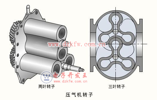 羅茨式壓氣機的轉子有兩葉的,也有三葉的。通常兩葉轉子為直線型,而三葉轉子為螺旋型。三葉螺旋型轉子有較低的工作噪聲和較好的增壓器特性。在相互嚙合的轉子之間以及轉子與殼體之間都有很小的間隙,并在轉子表面涂敷樹脂,以保持轉子之間以及轉子與殼體間較好的氣密性。轉子用鋁合金制造。