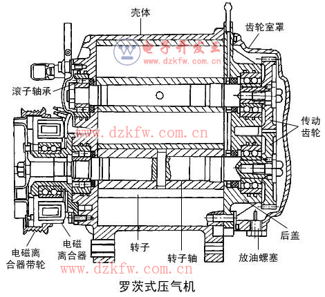 在機械增壓器當中,羅茨式壓氣機最廣為人知。它由轉子、轉子軸、傳動齒輪、殼體、后蓋和齒輪室罩等構成。在壓氣機前端裝有電磁離合器及電磁離合器帶輪。在羅茨式壓氣機中有兩個轉子。發動機 曲軸帶輪經傳動帶、電磁離合器帶輪和電磁離合器驅動其中的一個轉子,而另一個轉子則由傳動齒輪帶動與第一個轉子同步旋轉。轉子的前后端支承在滾子軸承上,滾子軸承和傳動齒輪用合成高速齒輪油潤滑。在轉子軸的前后端裝置油封,以防止潤滑油漏入壓氣機殼體內。