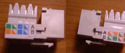 先來認識一下網線模塊,這個就是裝在家里網線插座后面的模塊 ,左右兩面,上面A、B表示的是兩種不同的打線方式,任選一種即可。