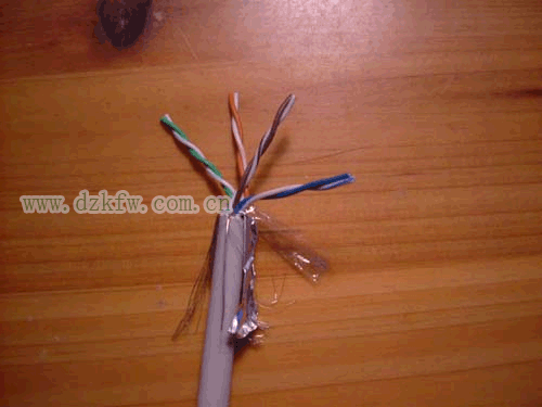下面開始打線了,首先還是先把網線的外皮剝掉,這次可以剝得長點兒,便于后面打線。露出了四組雙絞線: