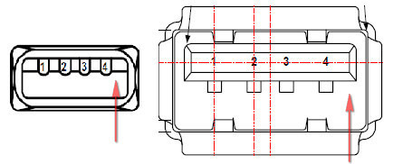 引腳順序(左側(cè)為Plug,右側(cè)為Receptacle,注意箭頭所指斜口向上,USB端口朝向自己):