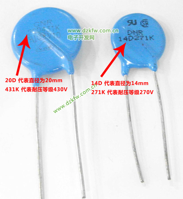 壓敏電阻與電容非常相似,它的上面一般標(biāo)有14D681K或14D681。14D表示直徑為14mm, 681表示擊穿電壓為680V,壓敏電阻一般損壞的表現(xiàn)為漏電,擊穿,和炸裂等故障。