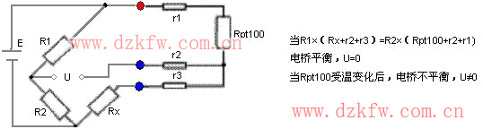 PT100引出的三根導線截面積和長度均相同(即r1=r2=r3),測量鉑電阻的電路一般是不平衡電橋,鉑電阻(Rpt100)作為電橋的一個橋臂電阻,將導線一根(r1)接到電橋的電源端,其余兩根(r2、r3)分別接到鉑電阻所在的橋臂及與其相鄰的橋臂上,這樣兩橋臂都引入了相同阻值的引線電阻,電橋處于平衡狀態,引線線電阻的變化對測量結果沒有任何影響。