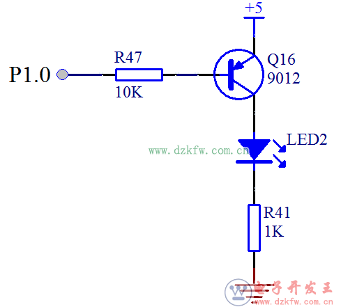 我們以圖 3-7 為例介紹一下。三極管基極通過一個 10K 的電阻接到了單片機的一個 IO口上,假定是 P1.0,發射極直接接到 5V 的電源上,集電極接了一個 LED 小燈,并且串聯了一個 1K 的限流電阻最終接到了電源負極 GND 上。如果 P1.0 由我們的程序給一個高電平 1,那么基極 b 和發射極 e 都是 5V,也就是說 e到 b 不會產生一個 0.7V 的壓降,這個時候,發射極和集電極也就不會導通,那么豎著看這個電路在三極管處是斷開的,沒有電流通過,LED2 小燈也就不會亮。如果程序給 P1.0 一個低電平 0,這時 e 極還是 5V,于是 e 和 b 之間產生了壓差,三極管 e 和 b 之間也就導通了,三極管 e 和 b 之間大概有 0.7V 的壓降,那還有(5-0.7)V 的電壓會在電阻 R47 上。
