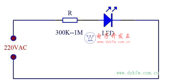 因此,如果是LED燈串聯(lián)電阻直接接220V交流電,限流電阻最好選擇300K以上1M以內(nèi)都是可以正常使用,選的電阻越大,電流越小,LED指示燈越耐用。因為220V交流電的峰值電壓高達(dá)310V,最好把LED指示燈的電流限制在1mA以內(nèi),反向才不會擊穿,若無亮度要求,電阻越大越好,保守一些最好選擇600K以上。